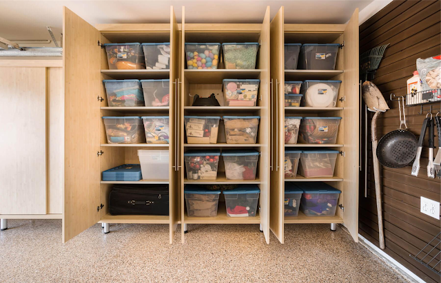 Kotak penyimpanan atau kontainer plastik adalah solusi yang baik untuk mengorganisir barang-barang kecil atau berukuran sedang. Anda dapat mengelompokkan barang-barang serupa dalam kotak-kotak ini dan menandainya dengan jelas agar mudah ditemukan. Juga, pastikan untuk memilih kotak-kotak yang dapat ditumpuk untuk menghemat ruang.