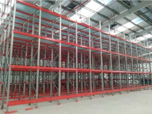 - Drive-In/Drive-Through Racking Sistem ini memungkinkan forklift untuk masuk ke dalam rak untuk menyimpan atau mengambil pallet. Drive-in racking menggunakan prinsip Last-In, First-Out (LIFO), sedangkan drive-through racking menggunakan First-In, First-Out (FIFO). Cocok untuk barang dengan volume besar dan variasi rendah.