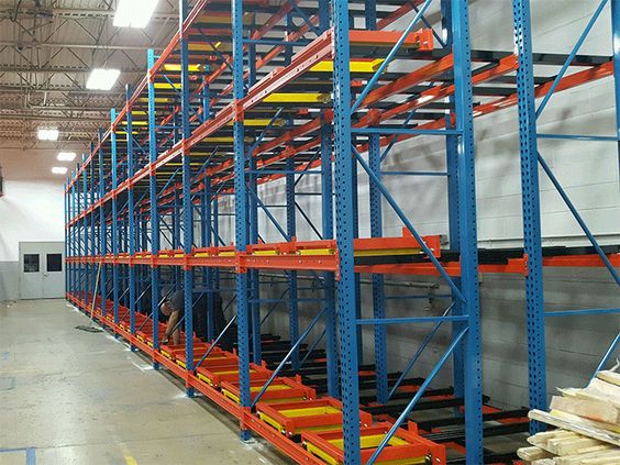 - Dirancang untuk memaksimalkan penggunaan ruang dan meningkatkan efisiensi pemilihan barang. Pallet diposisikan di ujung rak dan secara otomatis bergulir ke bagian depan saat satu pallet diambil.